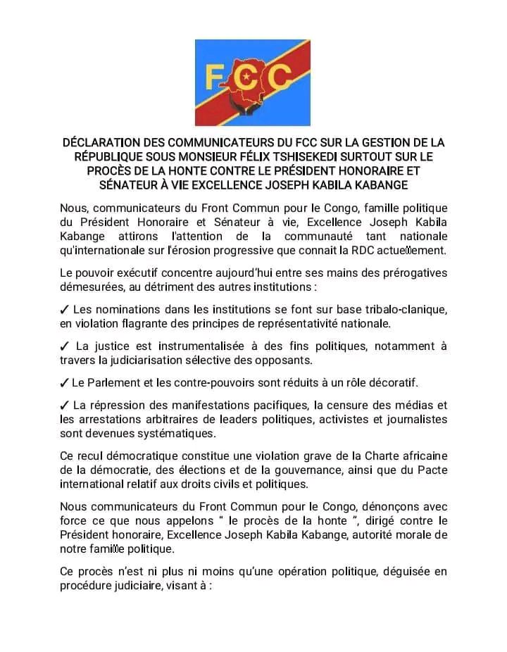 Le FCC rejette avec véhémence le procès intenté contre son autorité morale, Joseph Kabila Kabange, qu’il qualifie de « manœuvre politique déguisée en procédure judiciaire ».