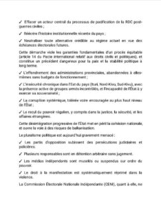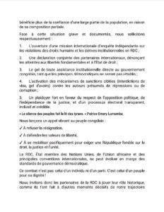 1. L’ouverture d’une mission internationale d’enquête indépendante sur les violations des droits humains et les dérives institutionnelles en RDC ;
